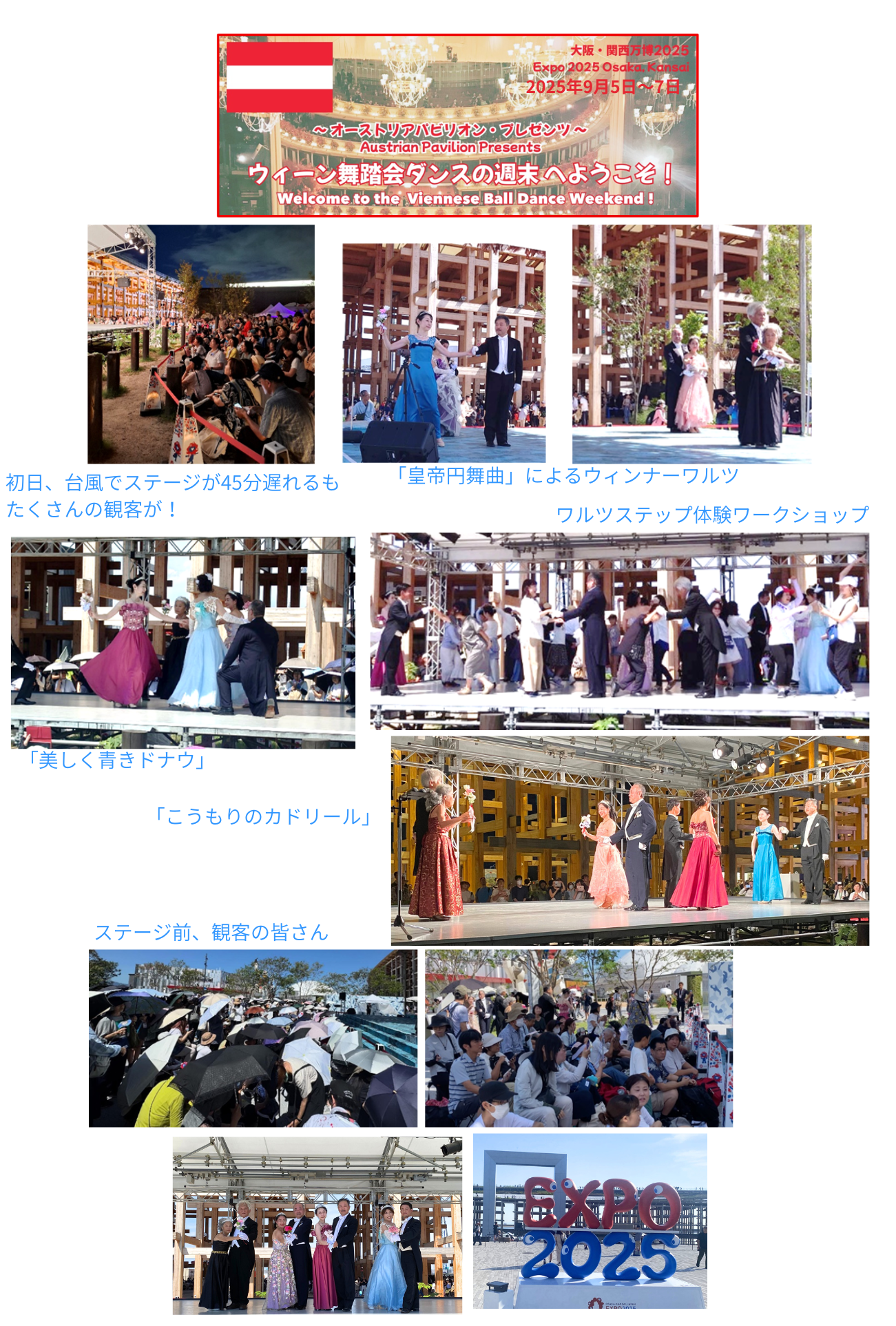 ハプニングもありましたが、公式プログラムとしてウィーン舞踏会文化を紹介でき、ウィンナーワルツの魅力を感じて頂けたことは一生の光栄です。万博協会関係者、パビリオンスタッフのひろえさん、共に踊ったメンバー、そして暑い中ご来場くださった皆様に心より感謝申し上げます。