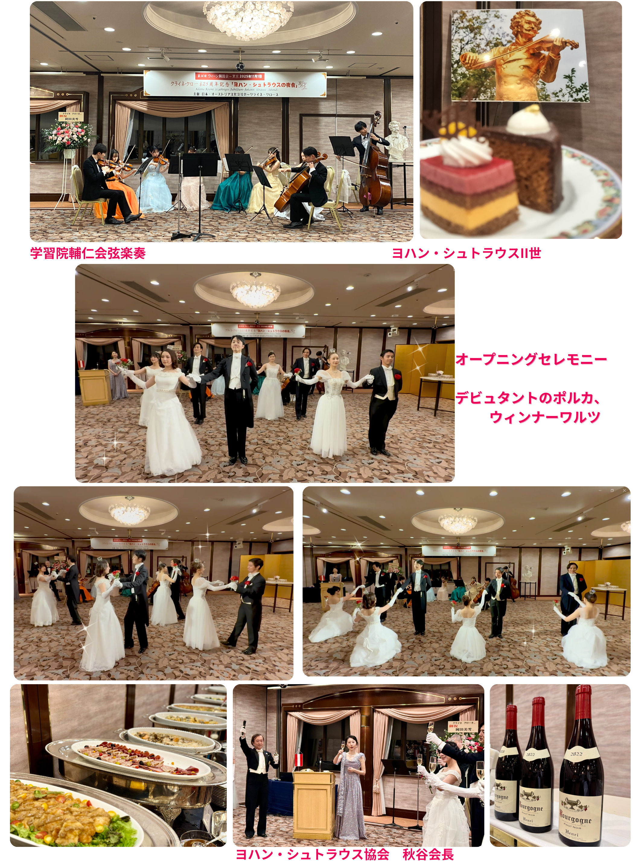 この「夜会」のために、万博出演時のたくさんの写真をパネルに作ってきて下さった秋谷会長、10年以上に渡りこの「夜会」で演奏をしてきて下さった学習院輔仁会弦楽の皆さん、コーディネートの塩入君、ウィンナーワルツをご披露下さった4組の皆様、そして感動的に美しかったデビュタントの方々、皆様のご協力で今年も華やかな非日常の開催ができました。